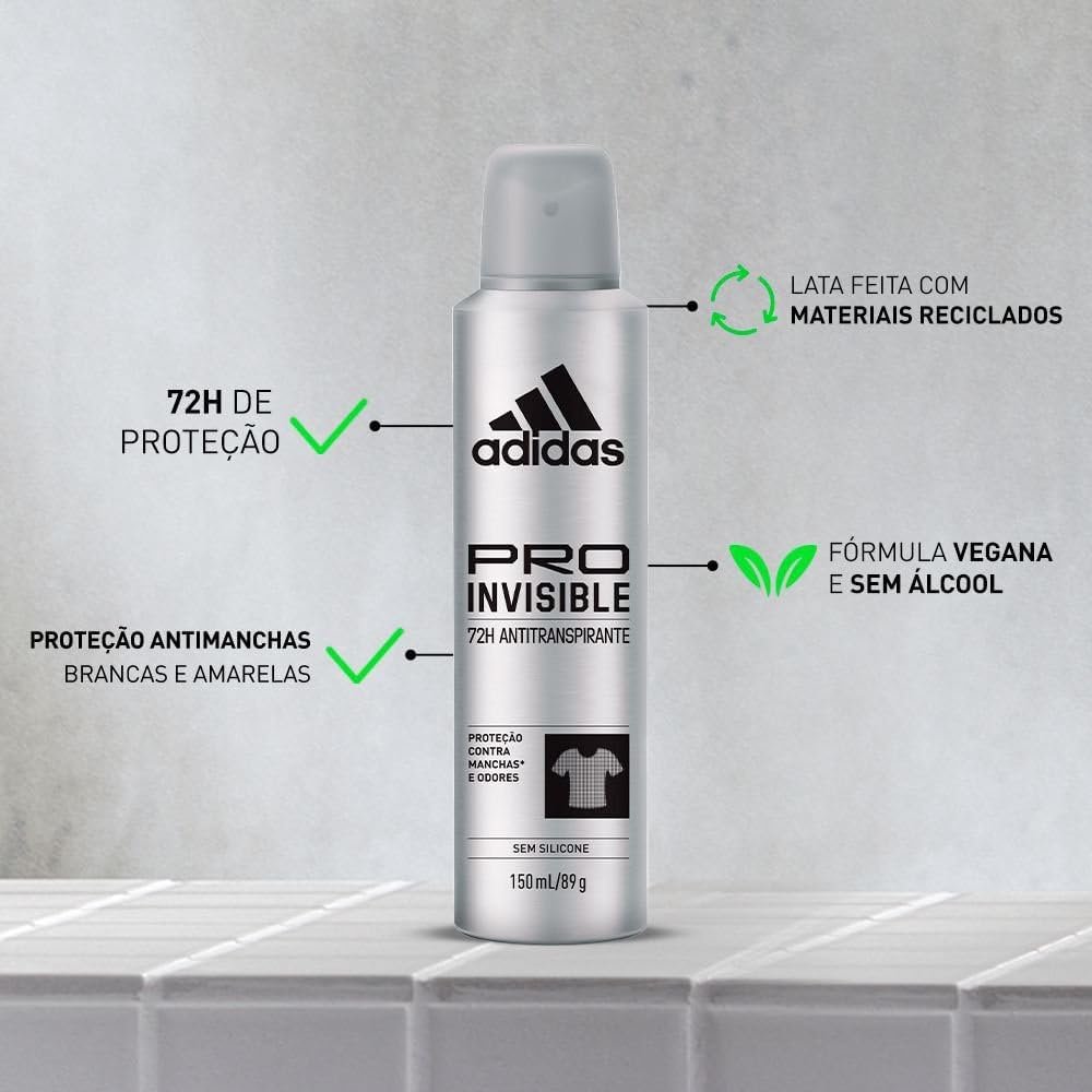 - Adidas Pro Invisible é o desodorante antitranspirante desenvolvido com atletas e para atletas, para deixar as axilas prontas para você dar o seu máximo. São 48h de proteção eficaz contra a transpiração, com sistema antimanchas brancas e amarelas, para dar a você a liberdade de vestir o que quiser, sejam roupas brancas, pretas ou coloridas. Adidas Pro Invisible também proporciona fragrância sofisticada e refrescante, com ação antibacteriana e zero álcool em sua fórmula. Dessa forma, Adidas respeita o pH da pele e evita possíveis irritações. Dermatologicamente testado para garantir que você atinja a máxima performance. Indicado para todos os tipos de pele.